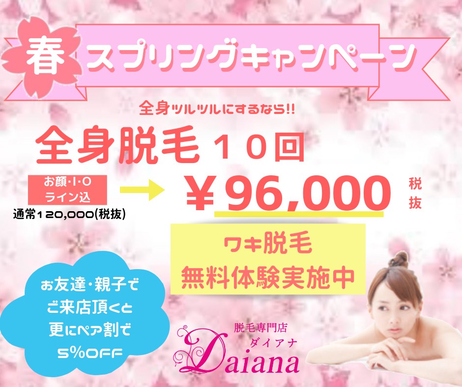 いつも松江市エステティックサロンDaiana~ダイアナ~のホームページをご覧頂きありがとうございます。 春休みに入り、沢山の学生さんにもご来店頂きとても嬉しく思っております またダイアナでは、親子で脱毛を始められる方も多く、親子脱毛デビュー'... -